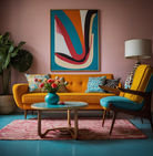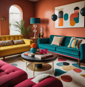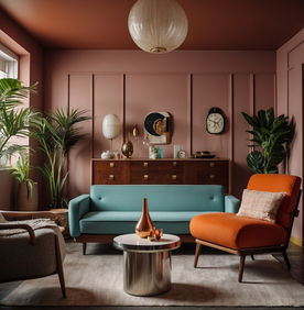 ビンテージ家具、幾何学模様、カラーブロック、ポップな色合い、レトロなアクセサリー。