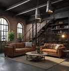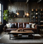 工場や倉庫のような無骨で荒削りなデザイン。金属、レンガ、木材などの素材感を強調。
